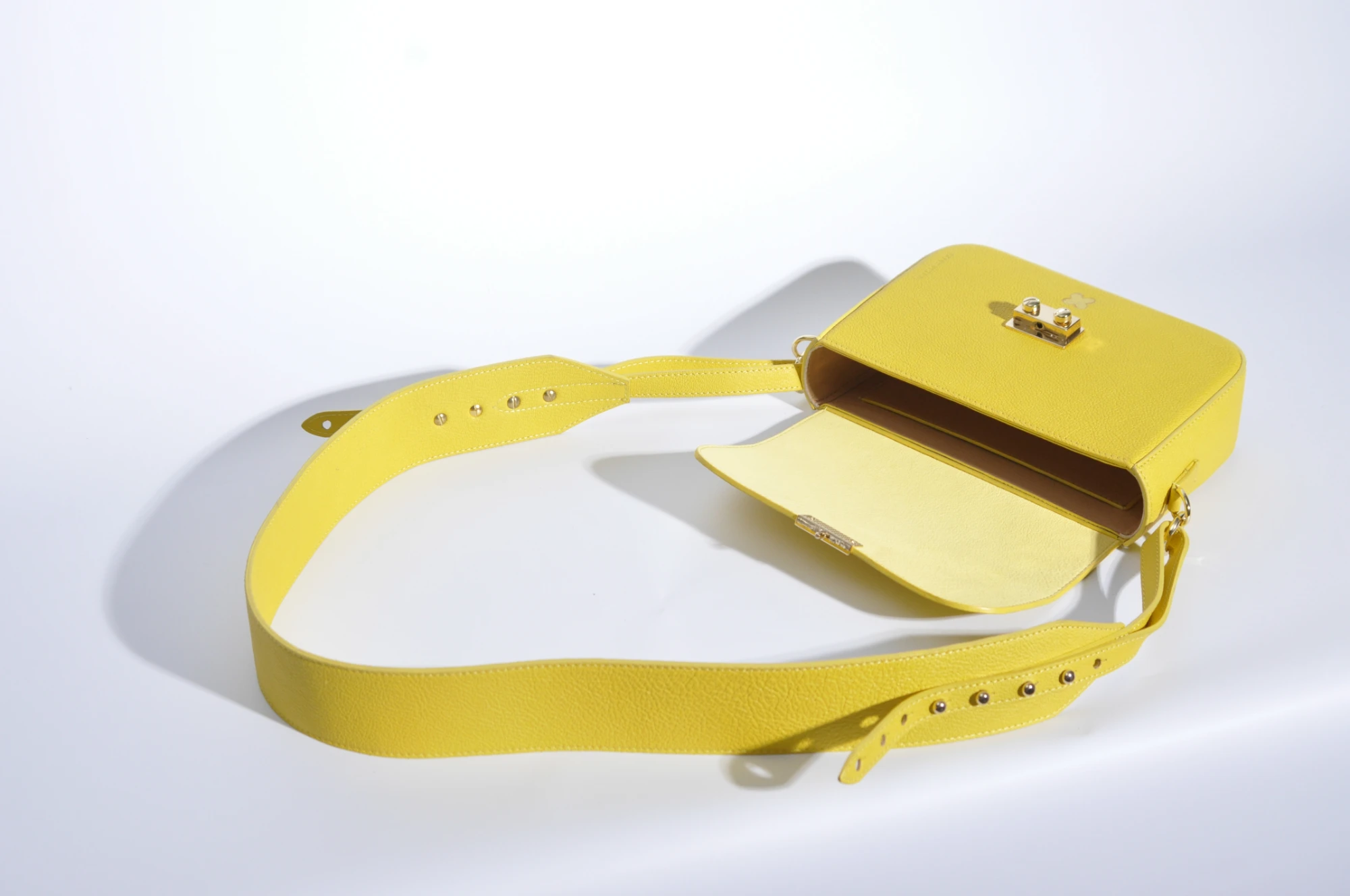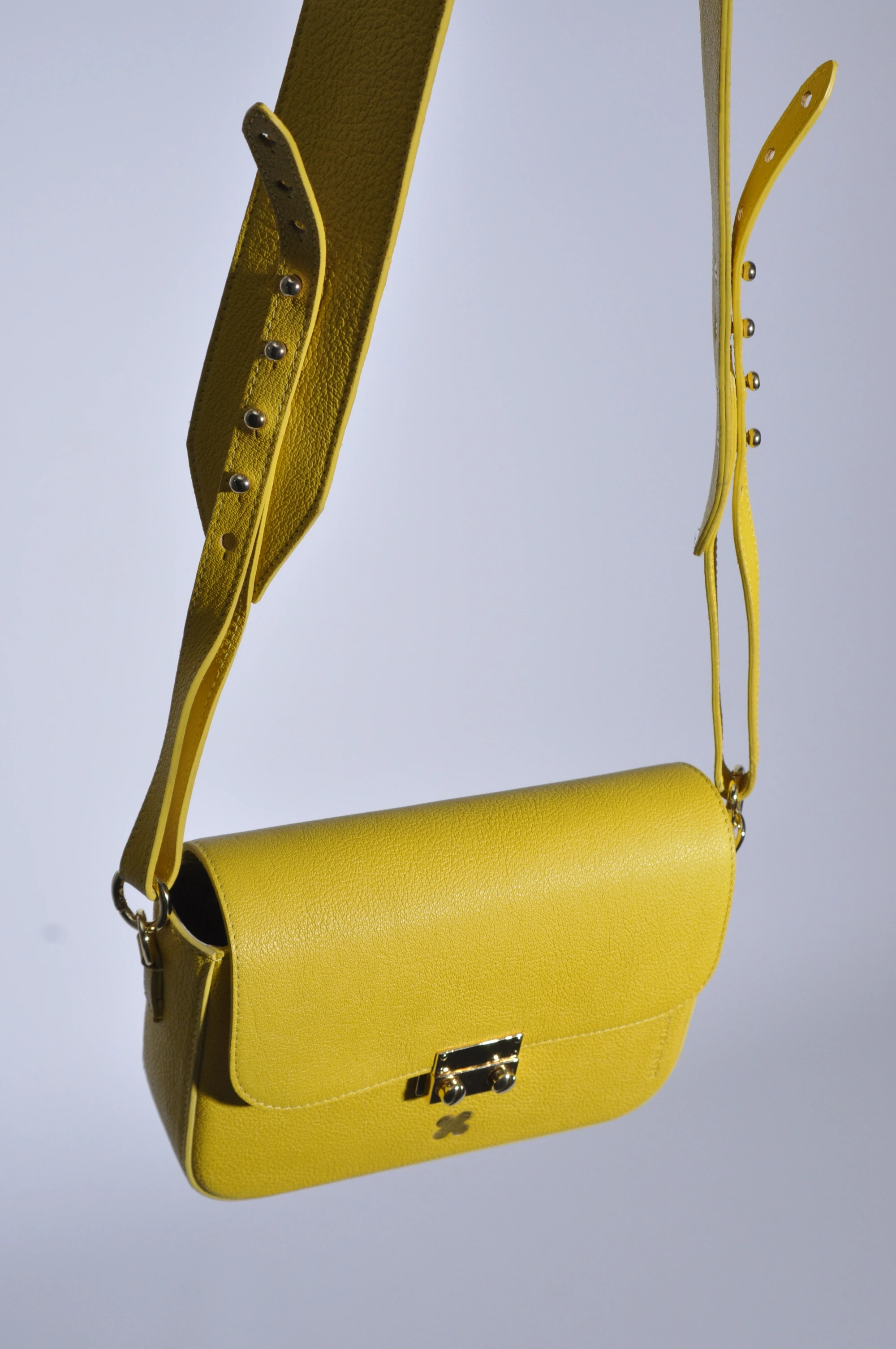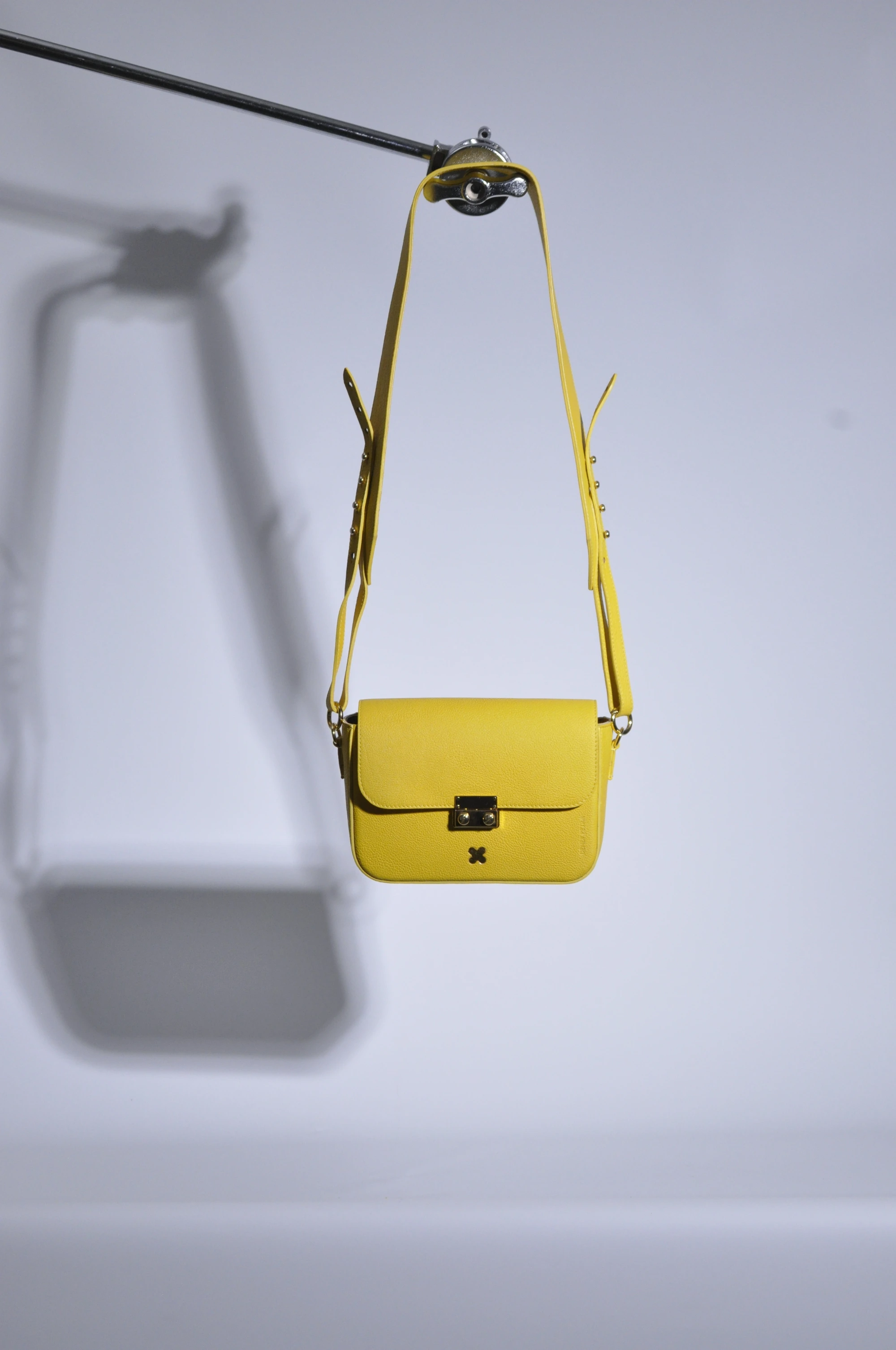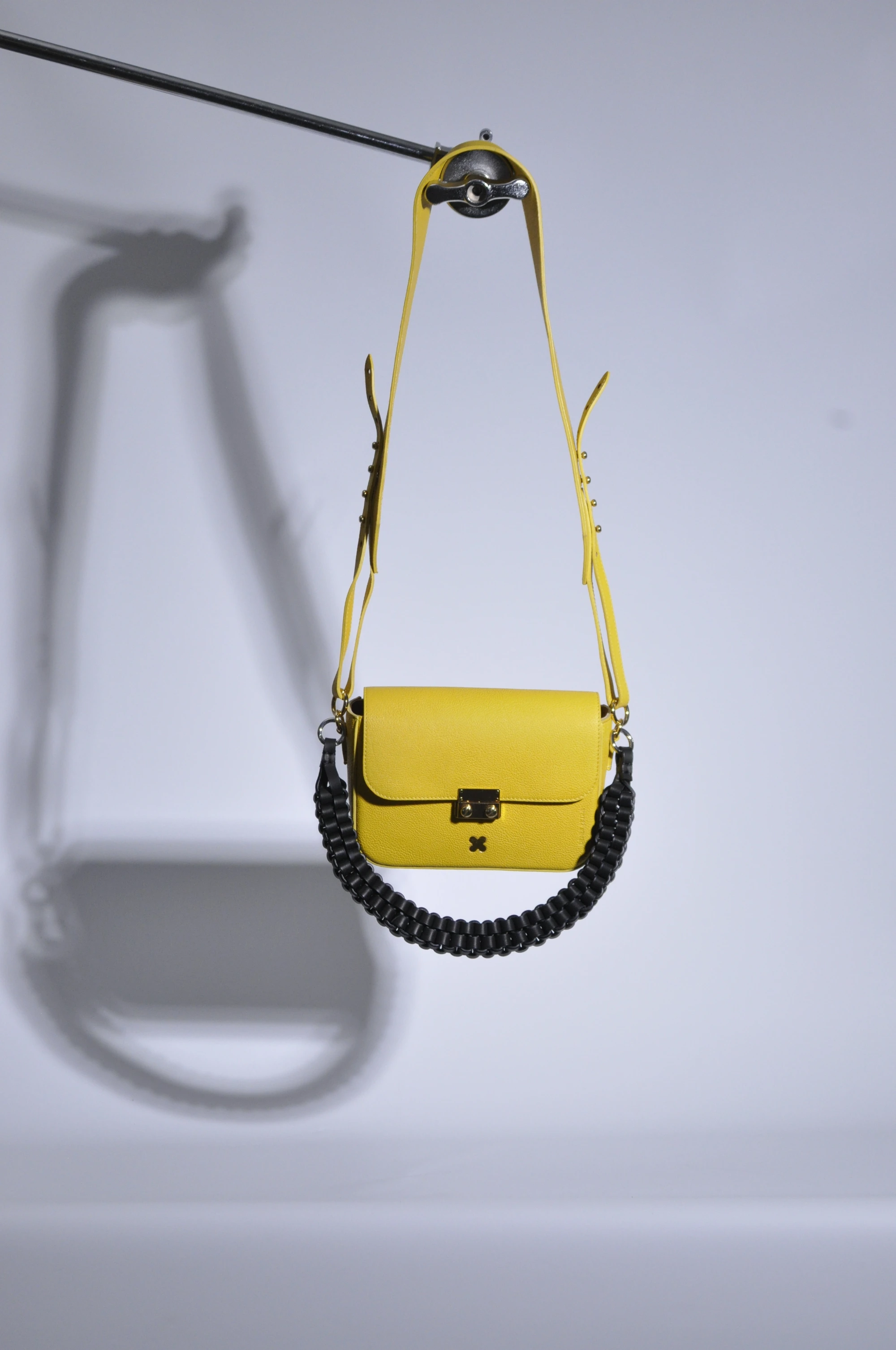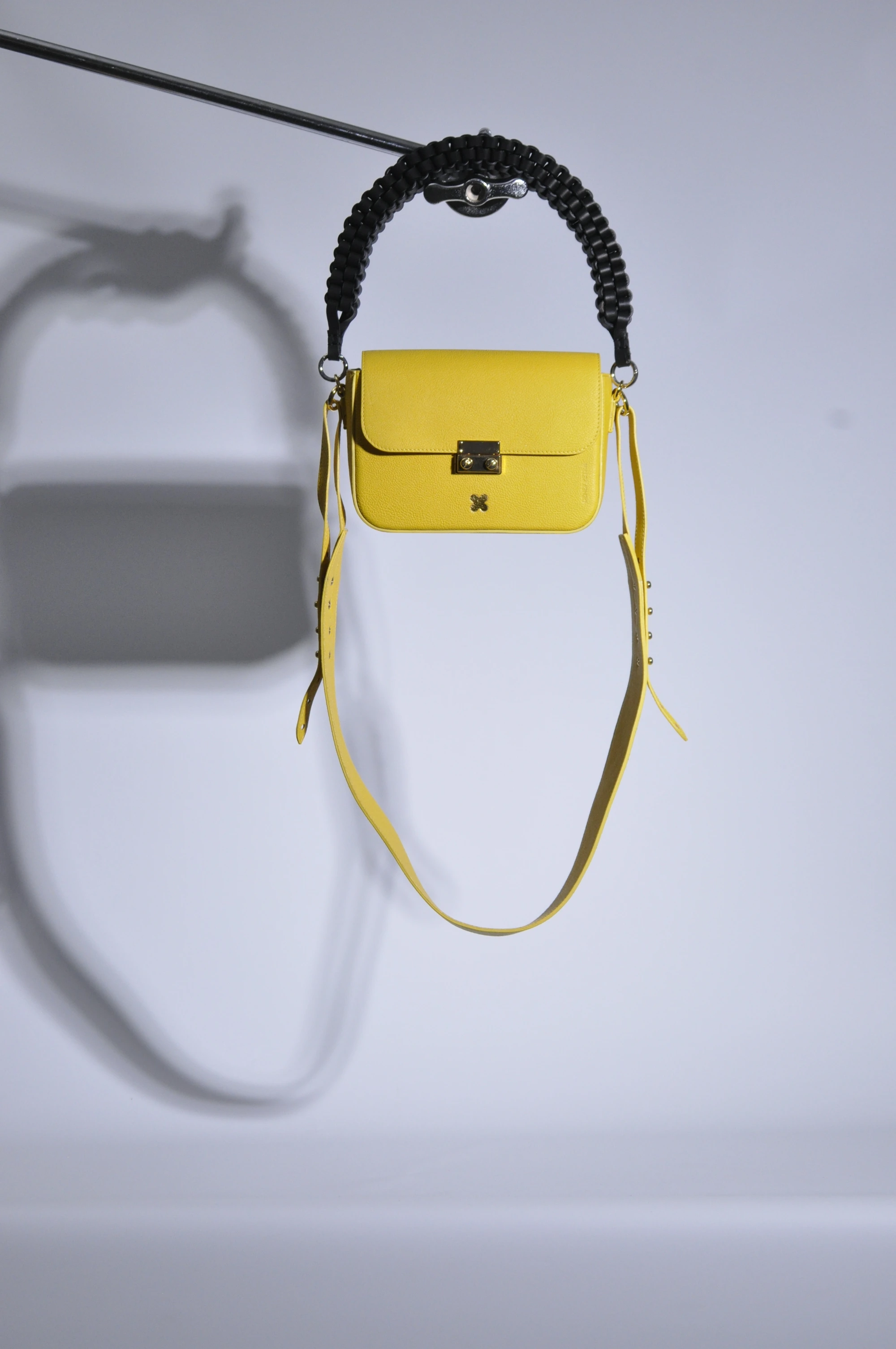 Merevített falú, kis méretű táska. Egyterű belsejében egy lapos zseb található. Ezüst színű két gombos táskazárral záródik. Crossbody, vállpántja pisztolygombos megoldással állítható hosszúságú. Külön rendelhető tartozék a fonott kézi fogó.