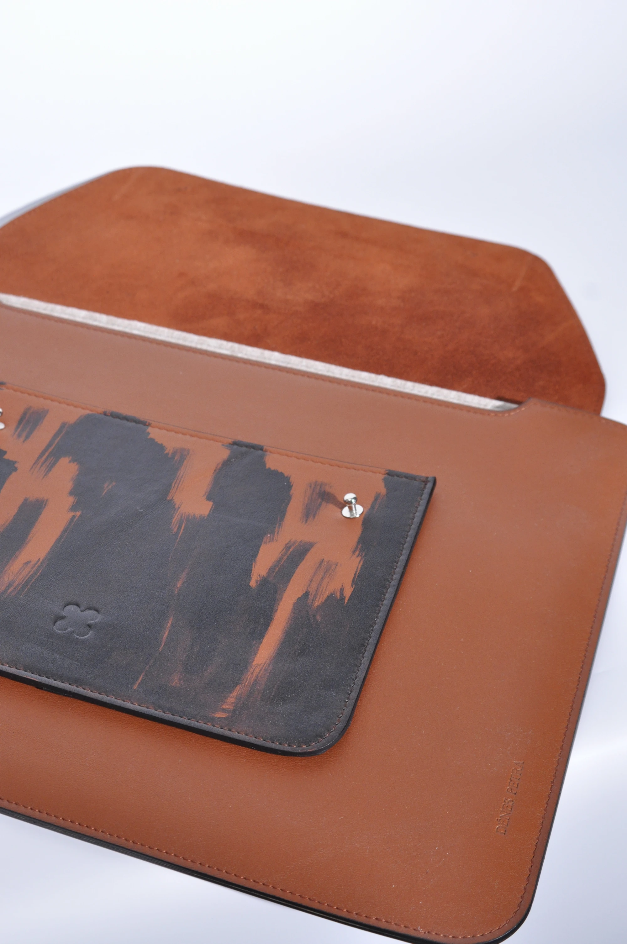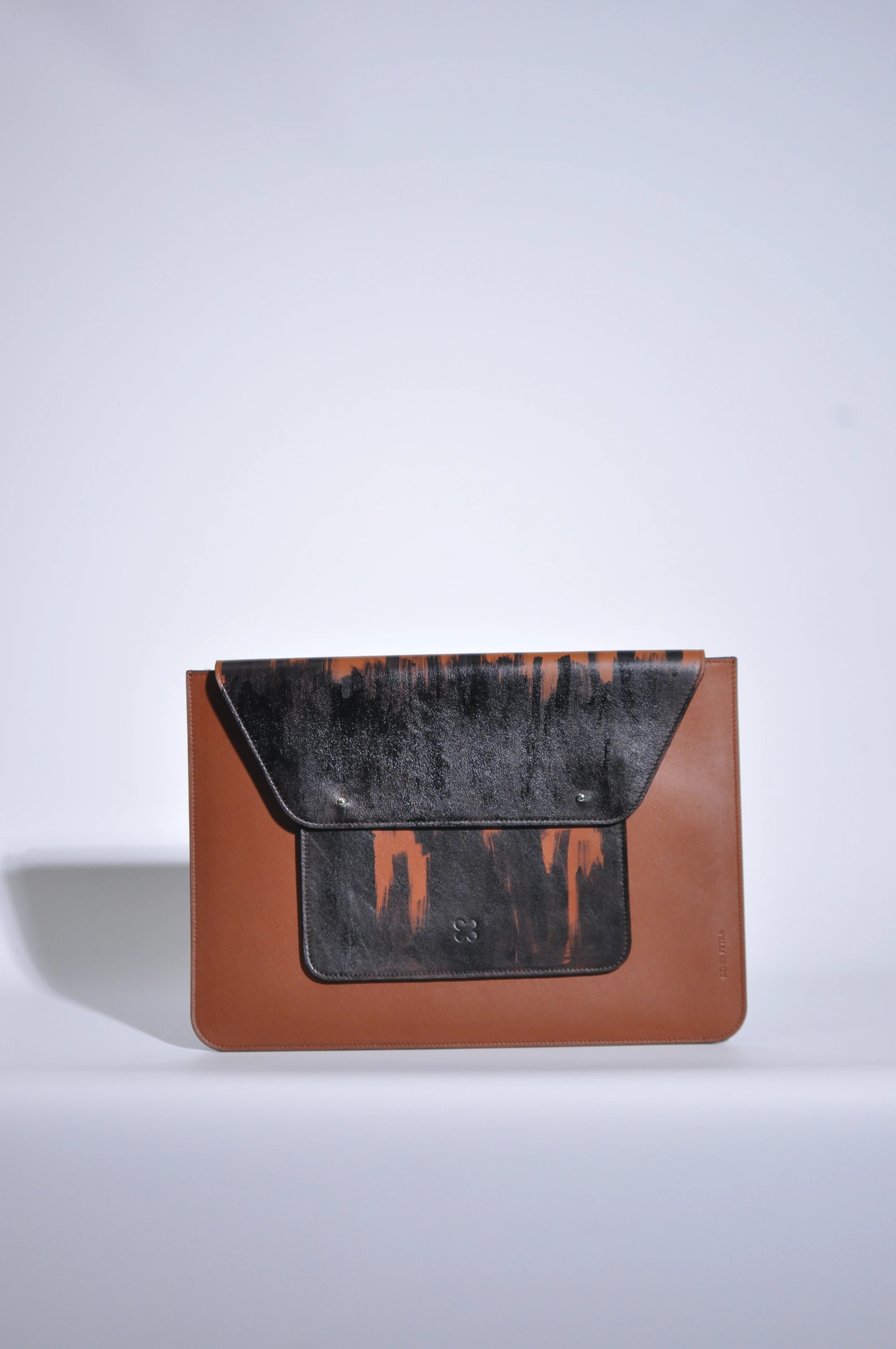 Pisztolygombos záródás, gyapjúfilc bélés, a főrész merevített. Két praktikus kisebb zsebbel kiegészítve, laptopon kívül A4-es méretű dokumentumok tárolására is alkalmas. A belső filc bélésének köszönhetően biztonságos a laptopoknak. Egyedi festéssel készült.