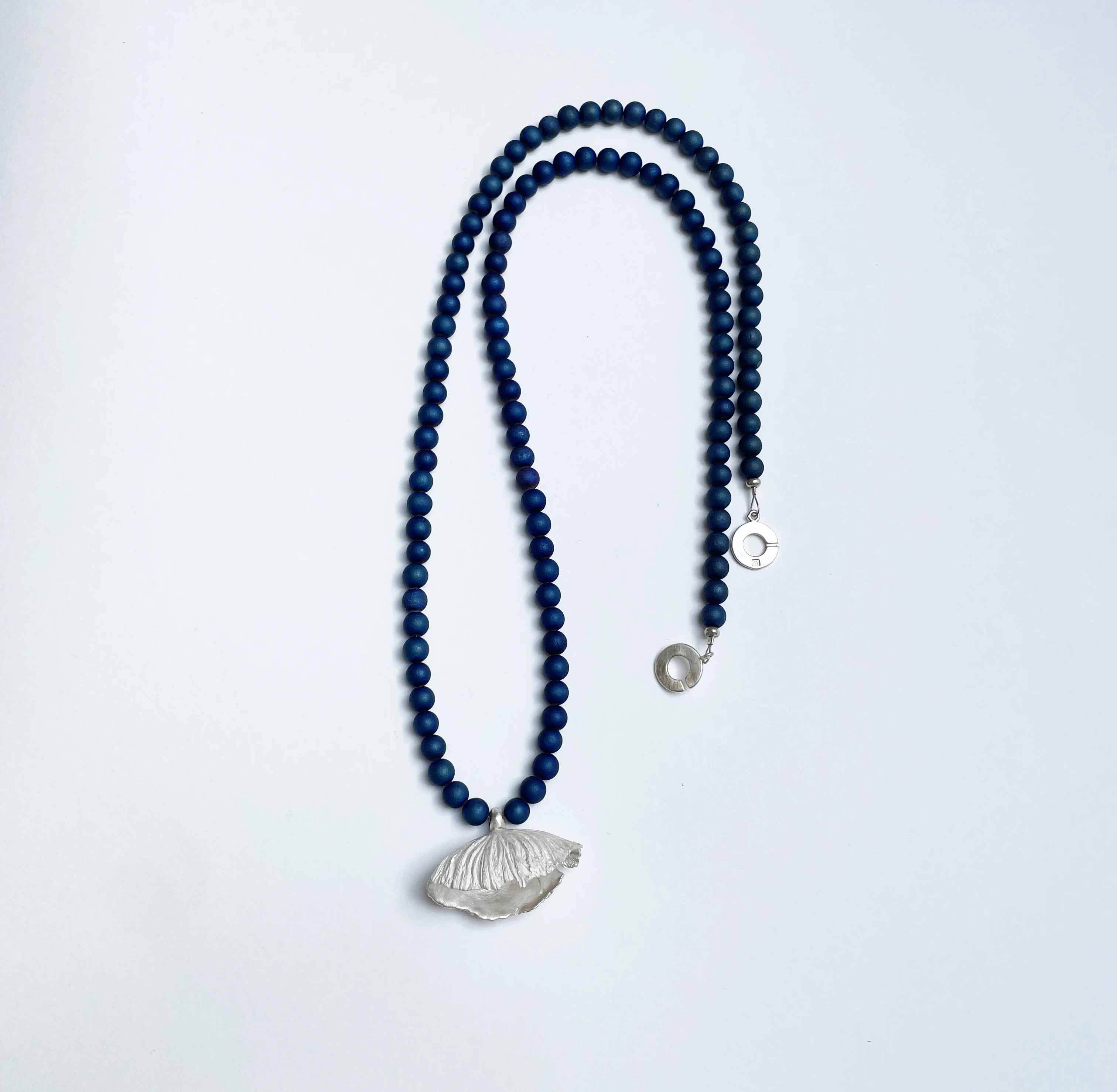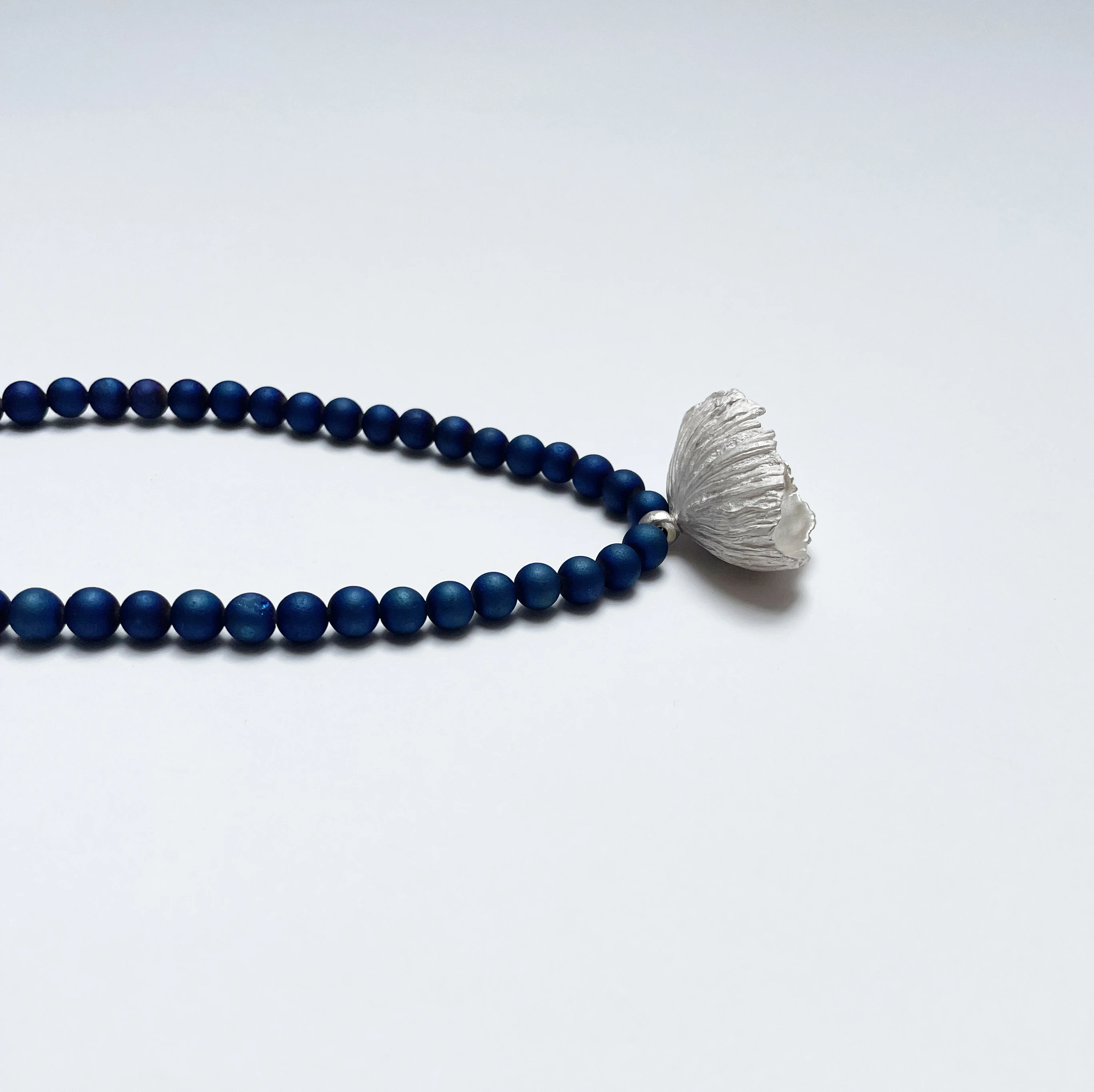 Ezüst florál függő metálkék felületkezeléssel ellátott üveggyöngyökből készült láncon ezüst záródással. Lánc hossza: 74 cm, Ezüstvirág: 3,8 x 2,5 x 2 cm
