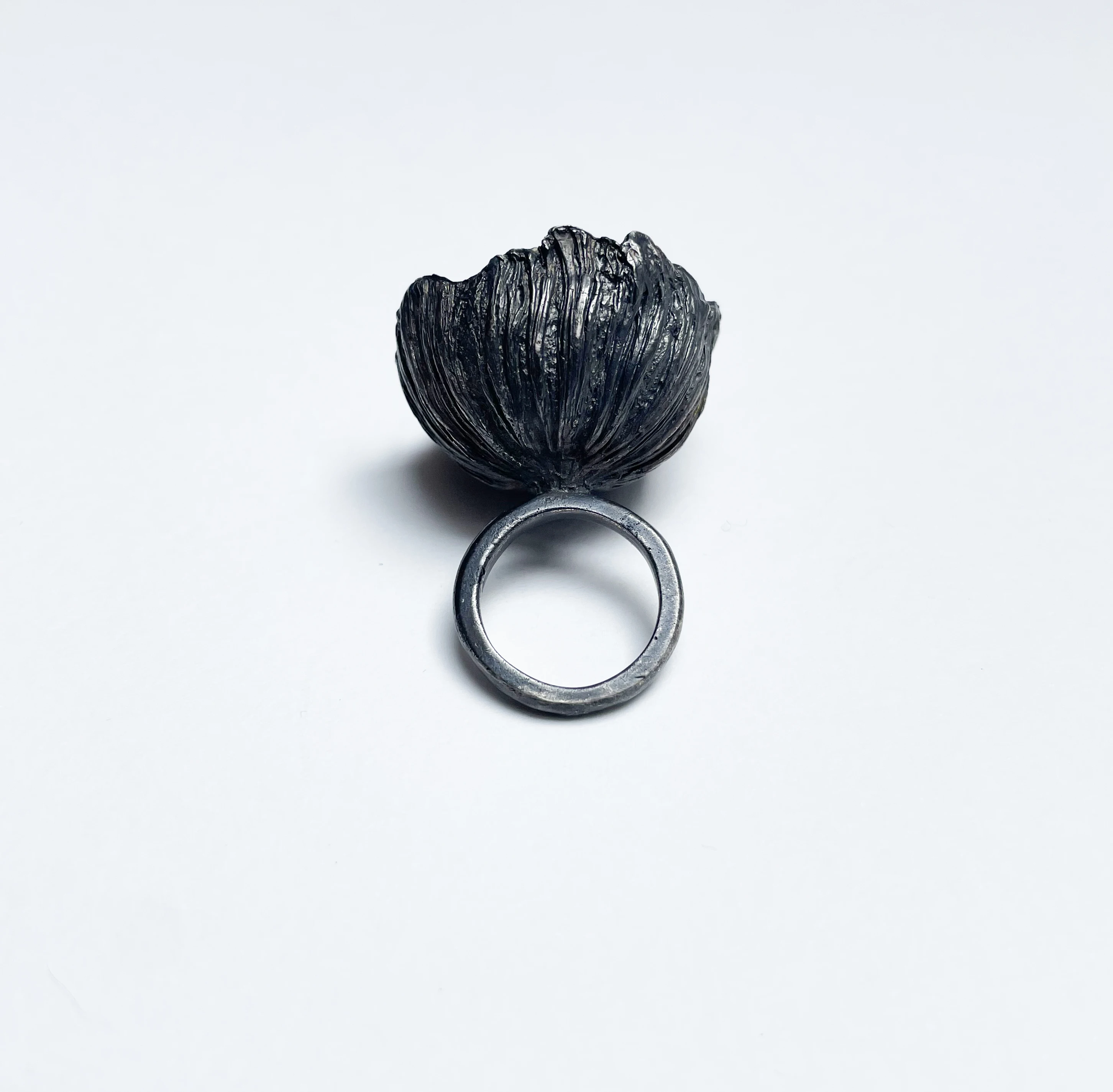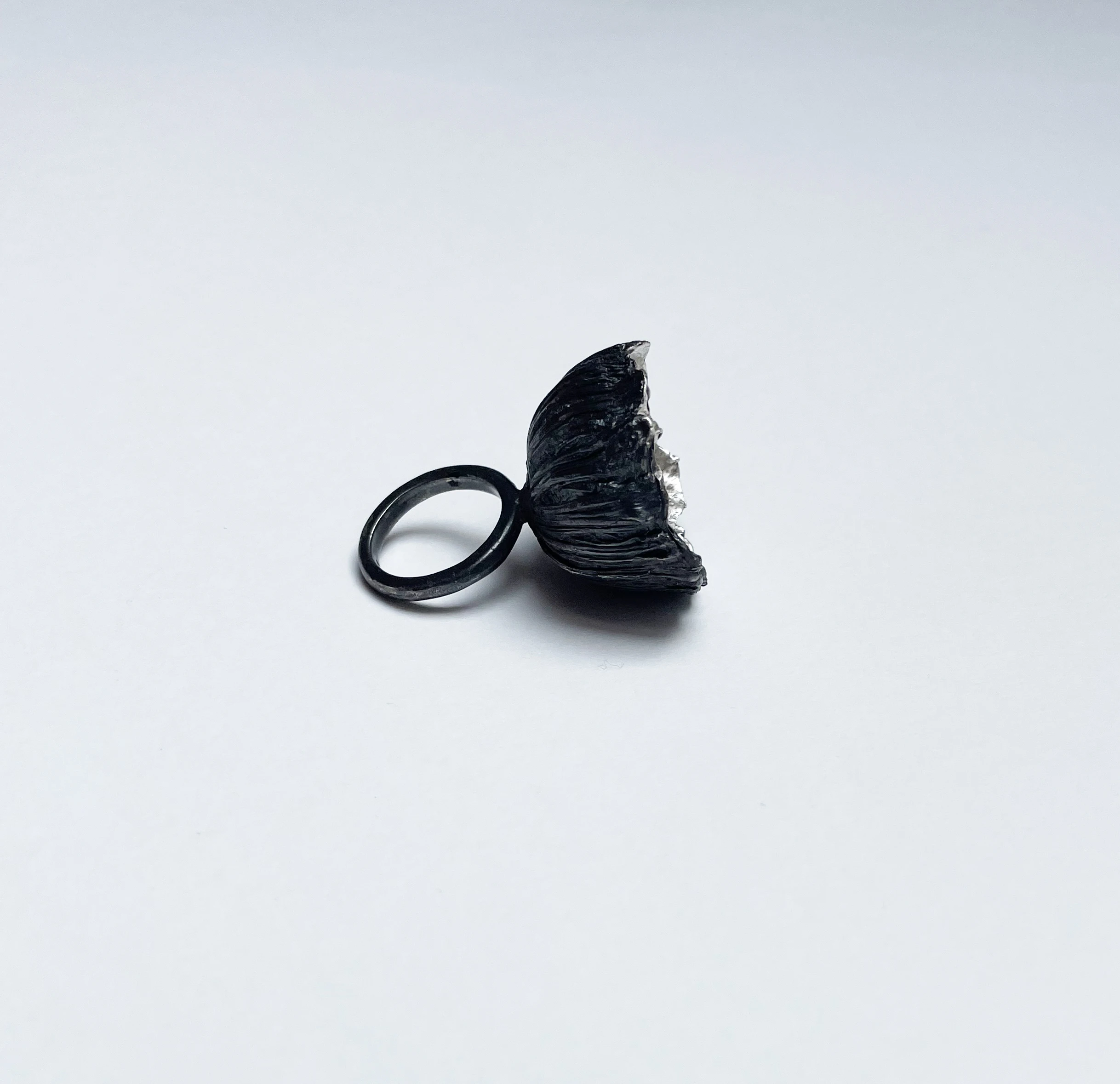 Ezüst Florál gyűrű kehely alakú virággal, feketére patinázva, virág belső ezüst színű.