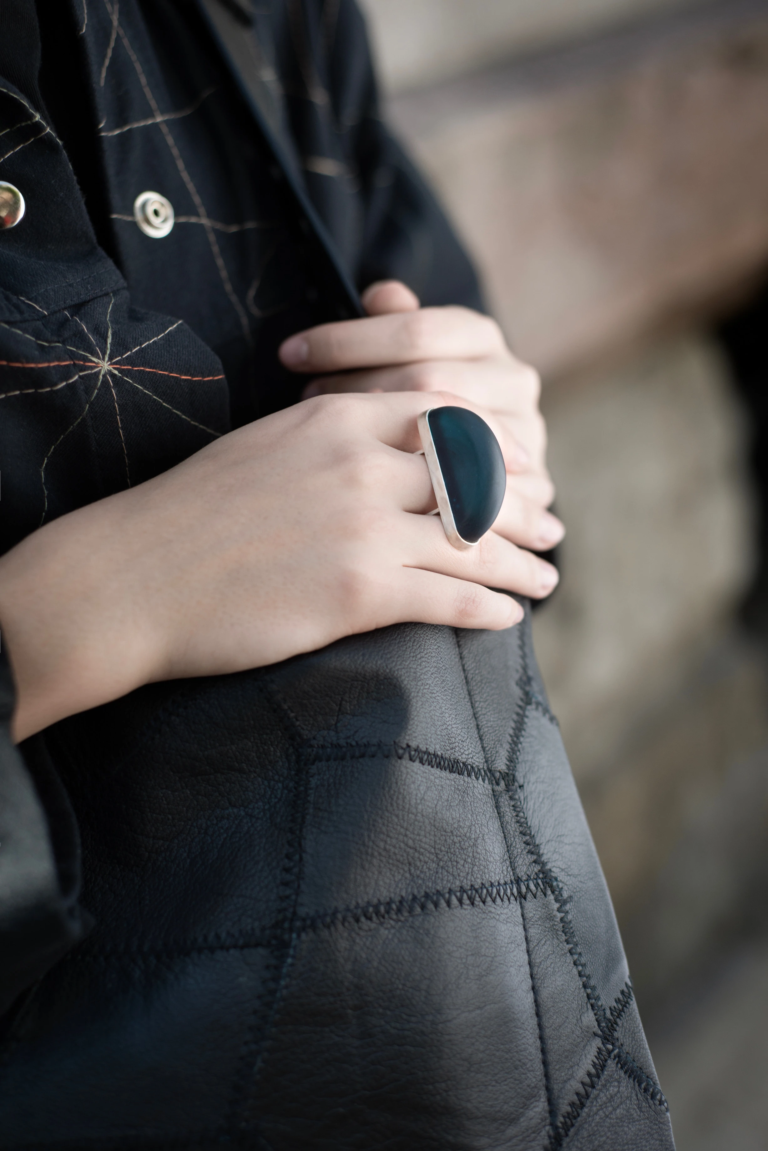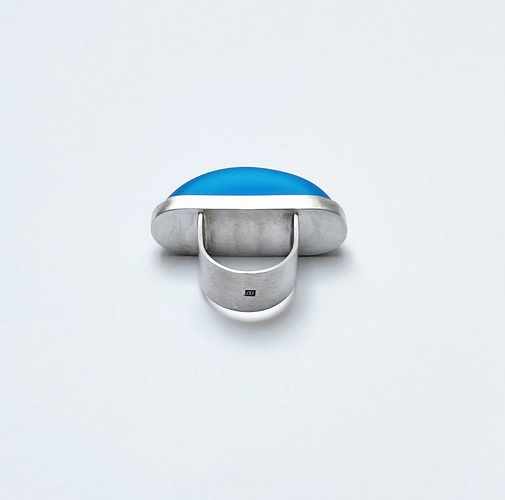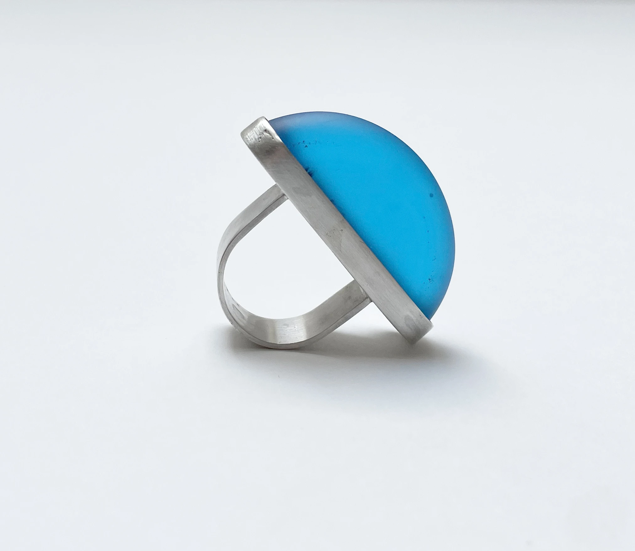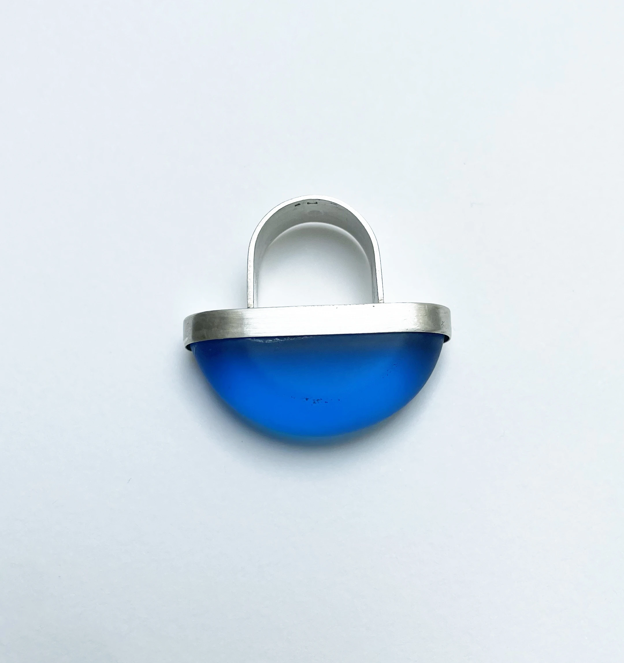 Íves mattított felületű üveg elem ezüst gyűrűbe foglalva.
