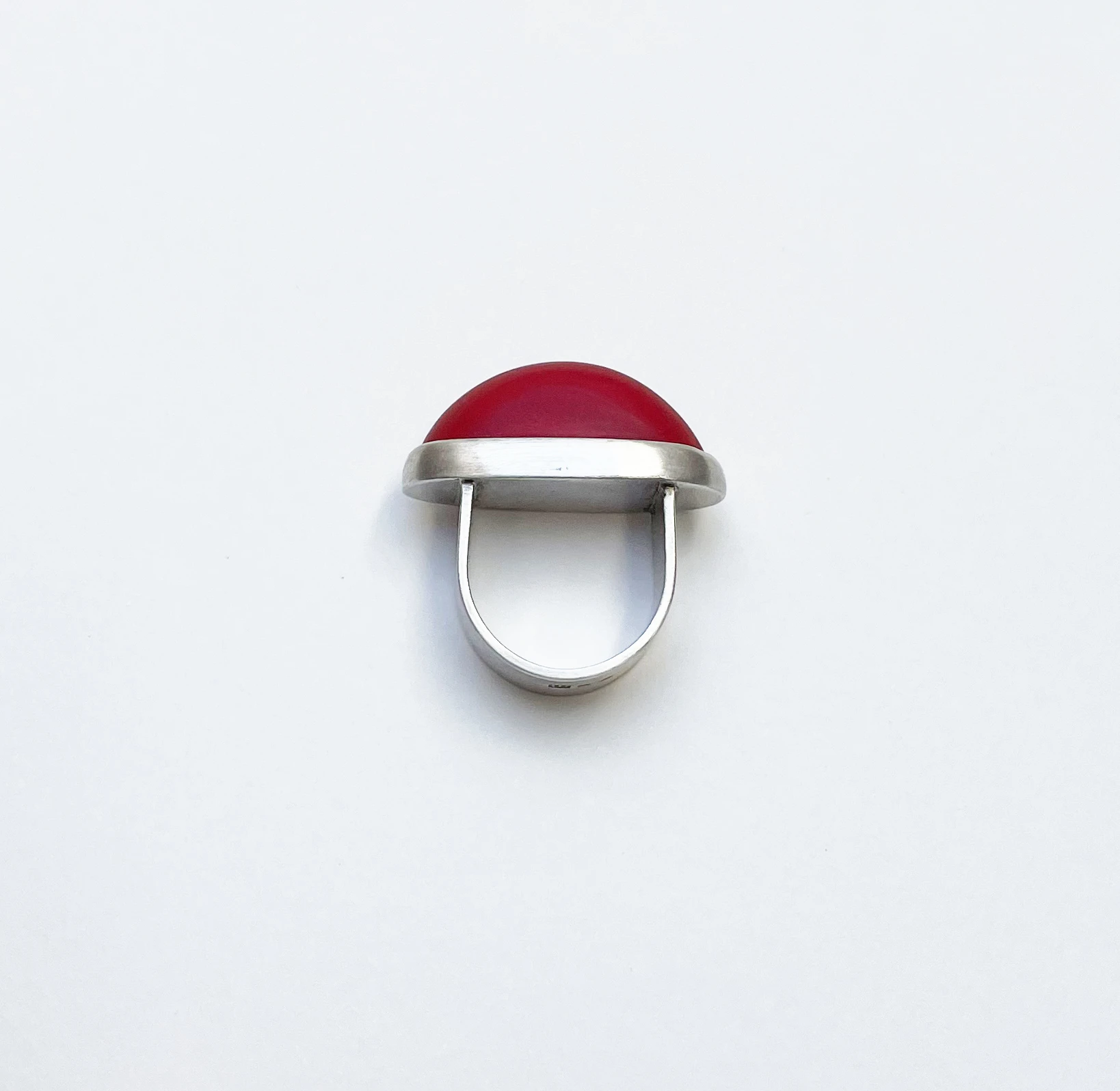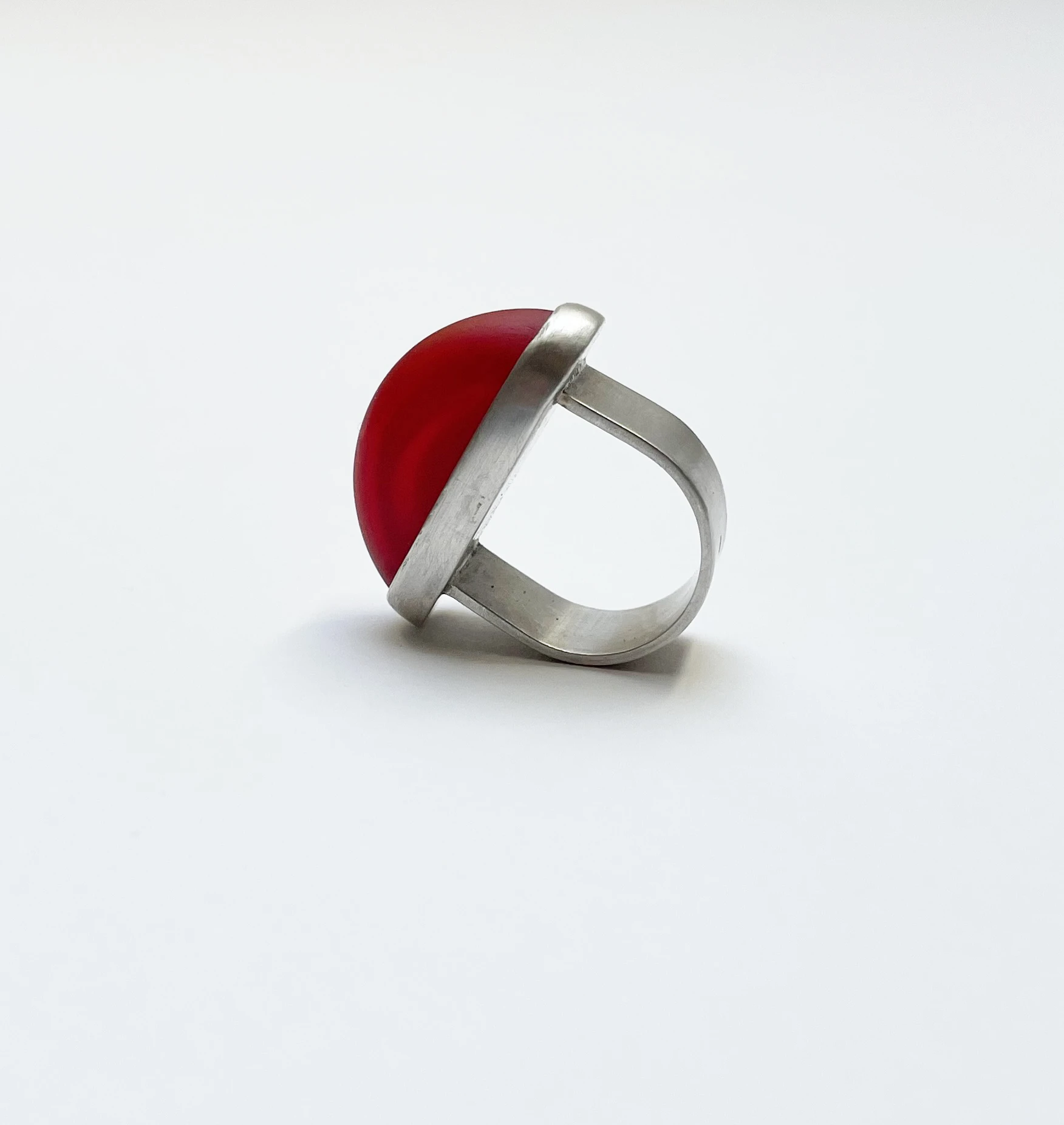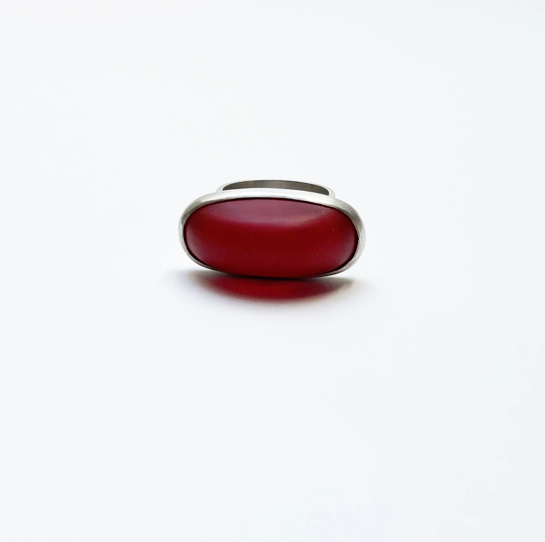 Íves mattított felületű üveg elem ezüst gyűrűbe foglalva.