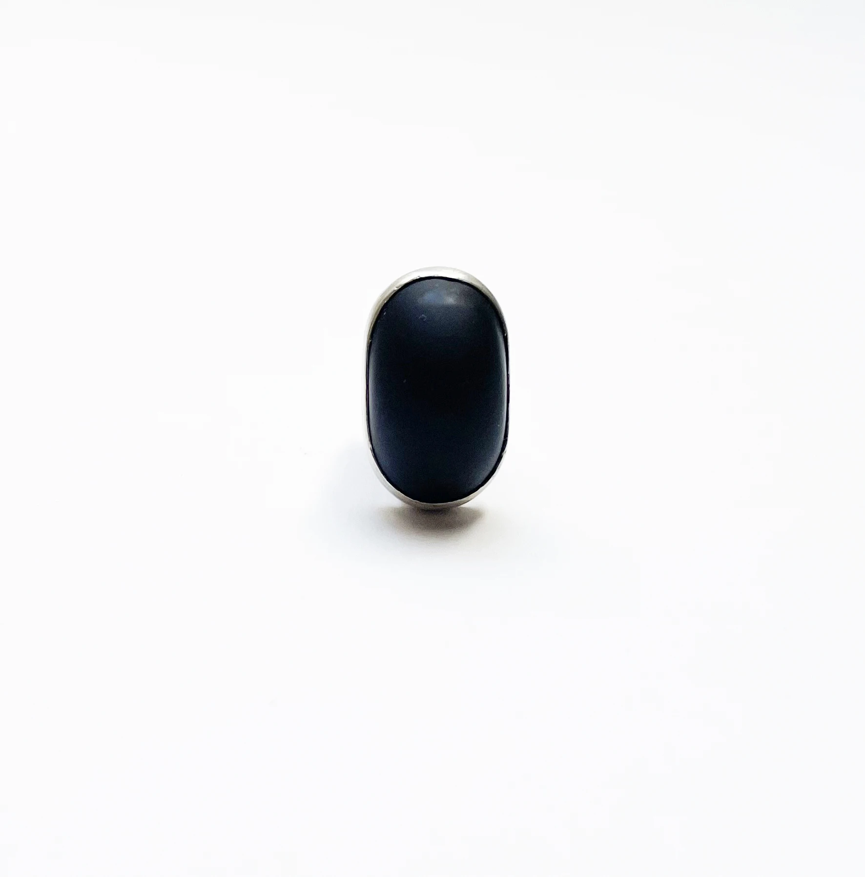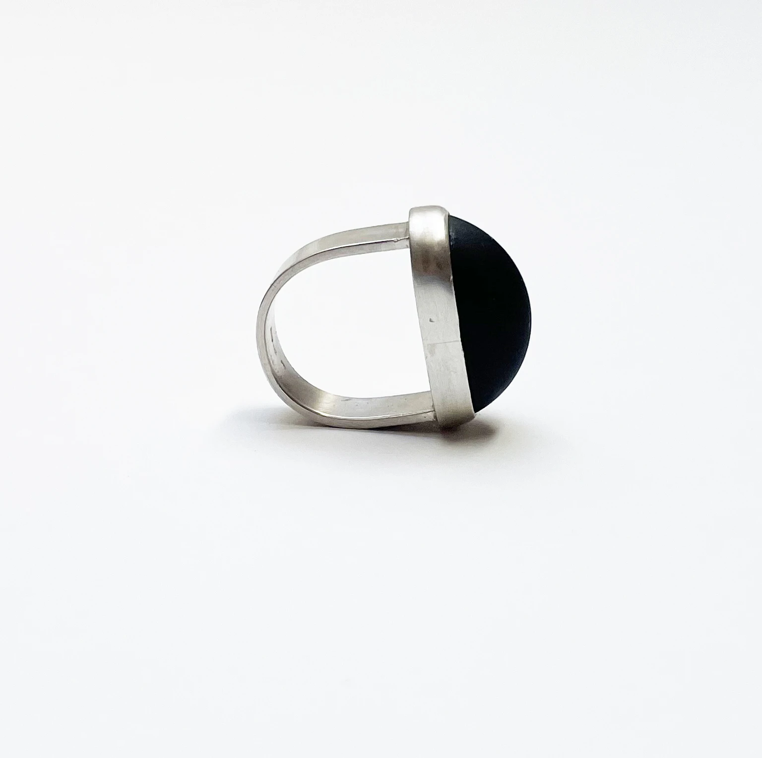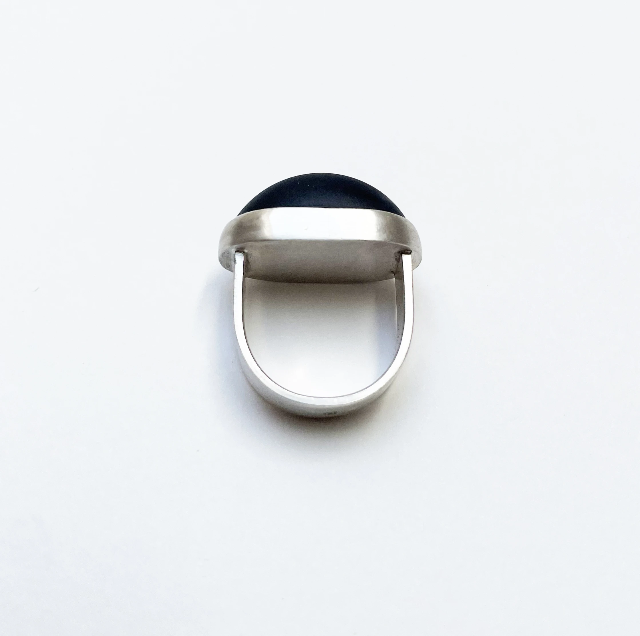 Íves mattított felületű üveg elem ezüst gyűrűbe foglalva.
