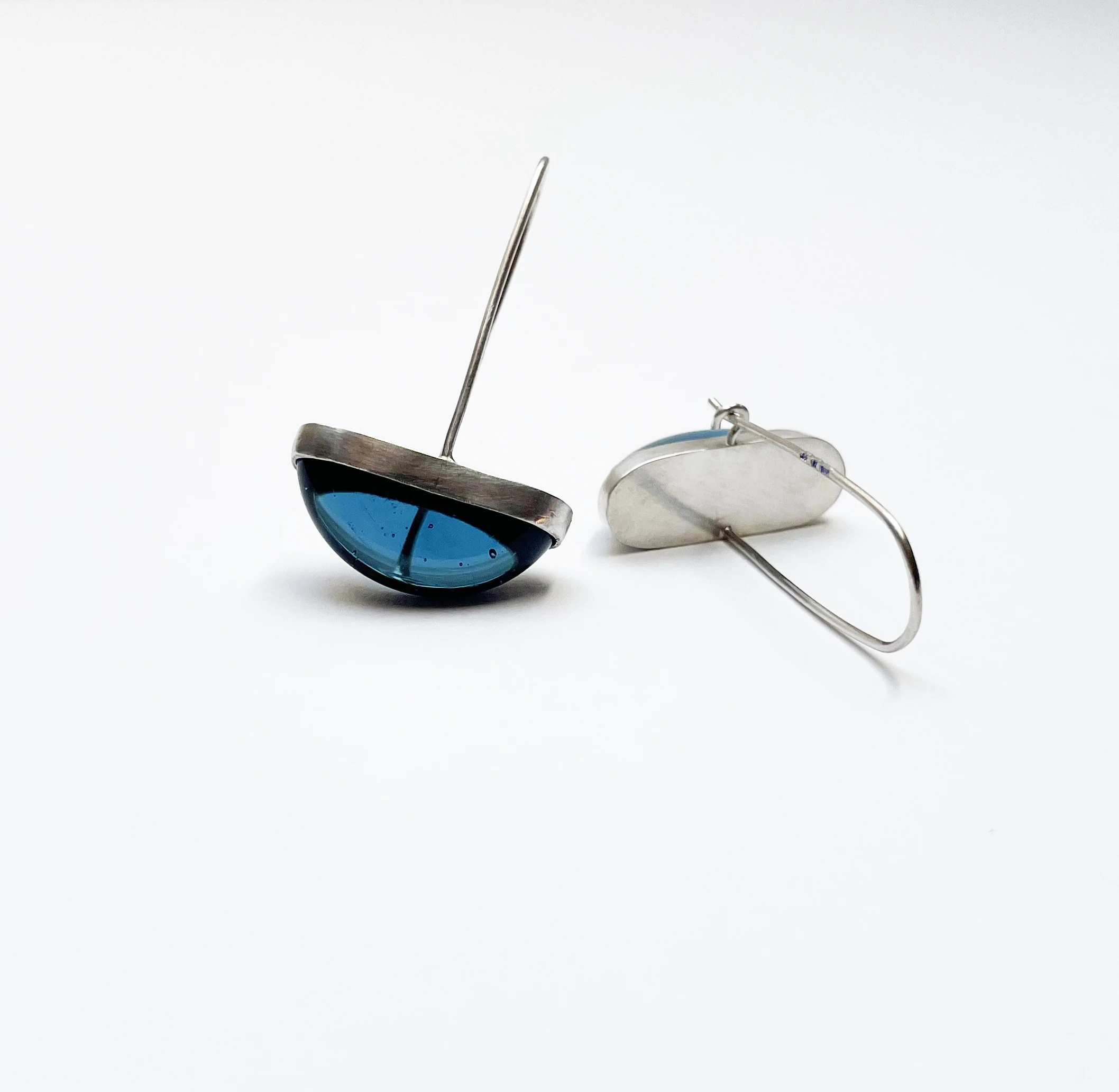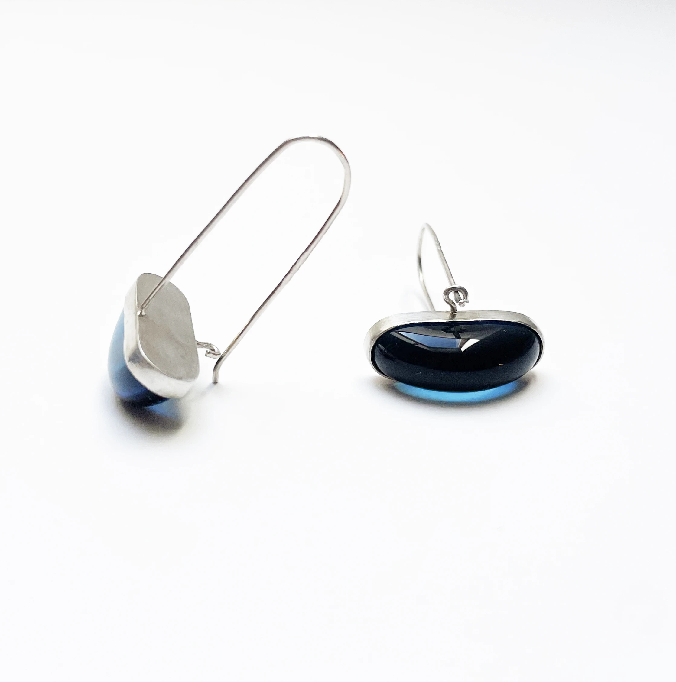 Nagy üvegfülbevaló fényes farmerkék üveggel, beakasztós szárral. Az üveg elem 2,4 cm, szárral 4 cm magas.