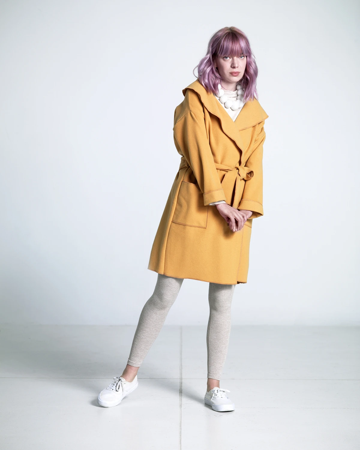Közepes hosszúságú sálgalléros kabát nagy zsebekkel