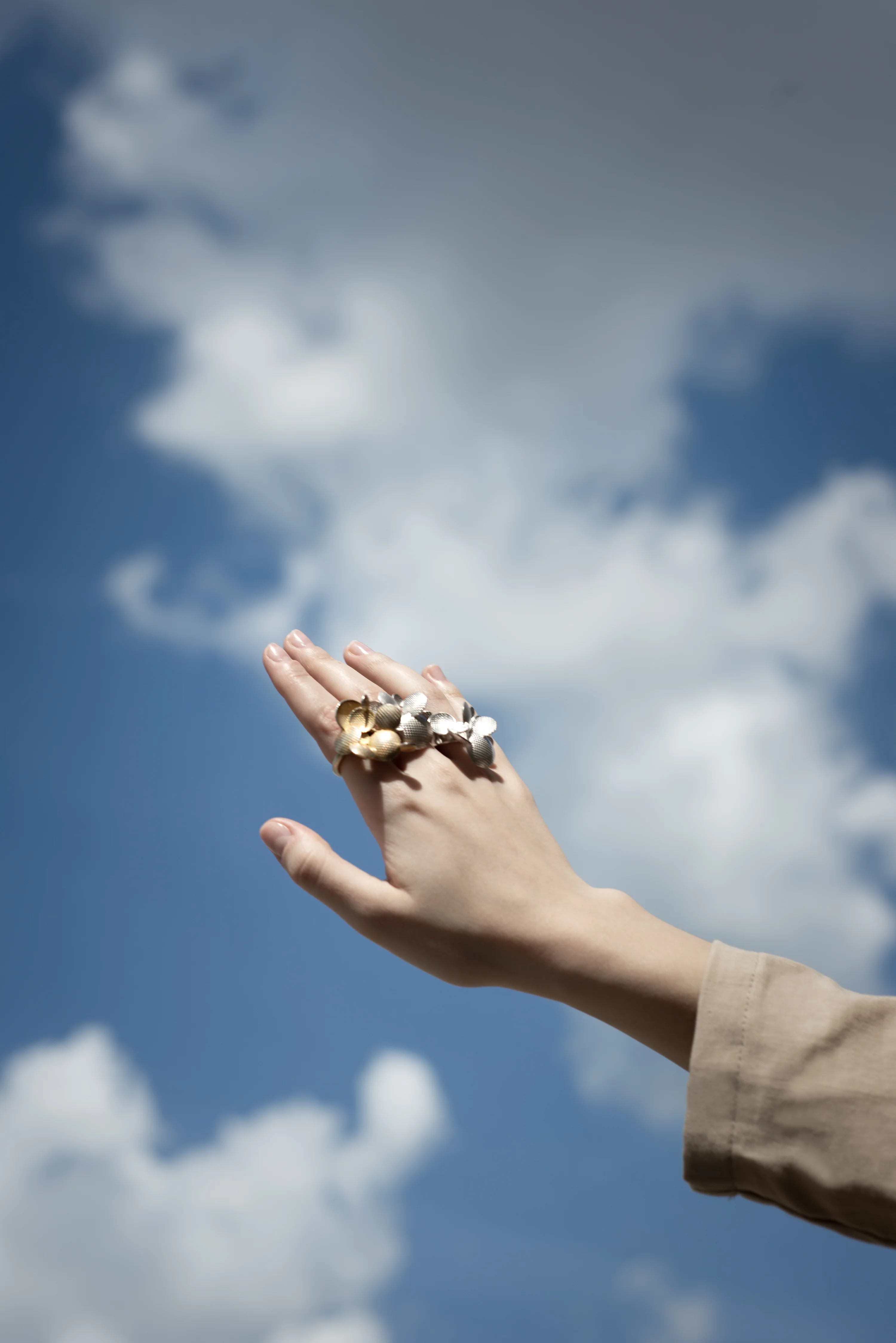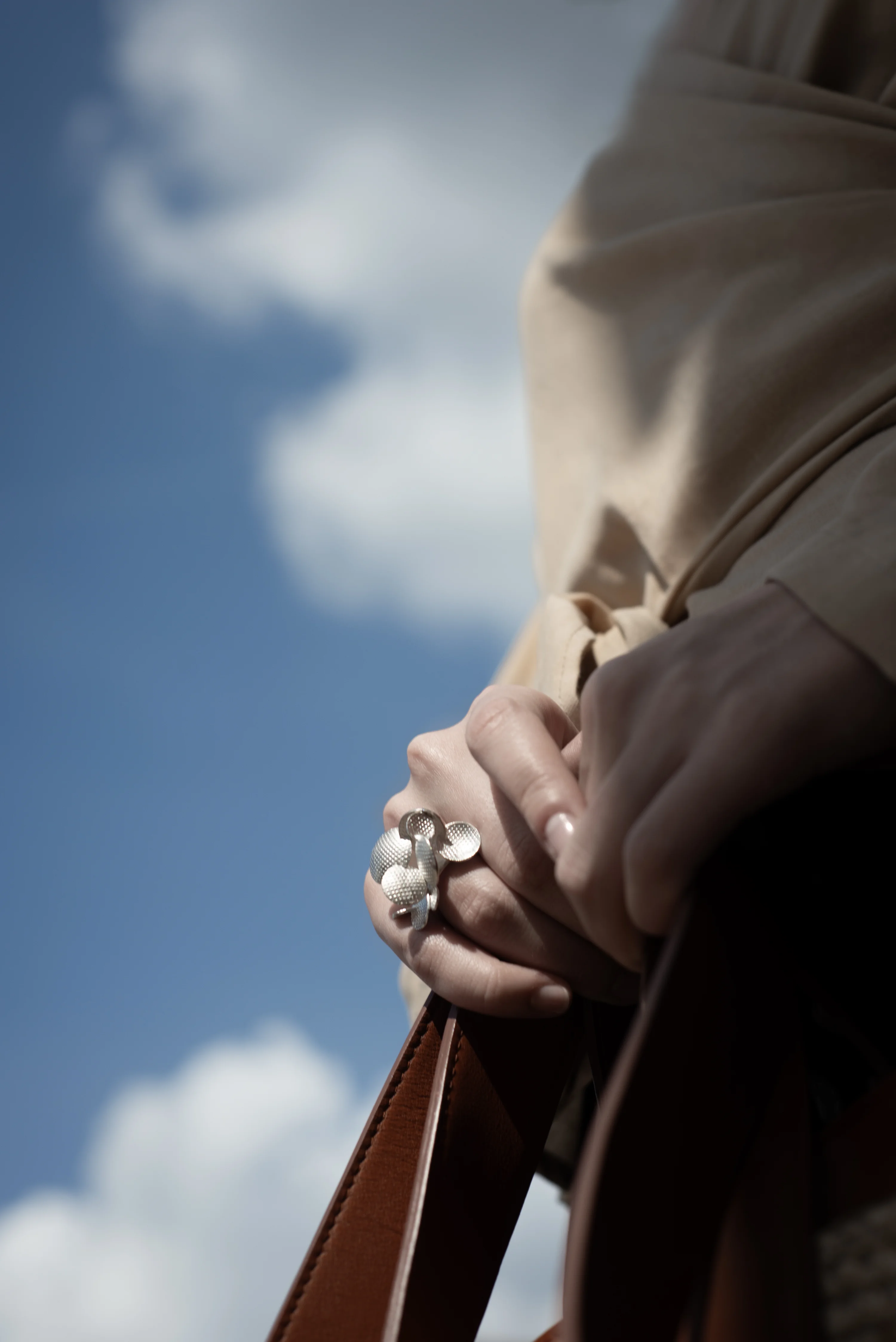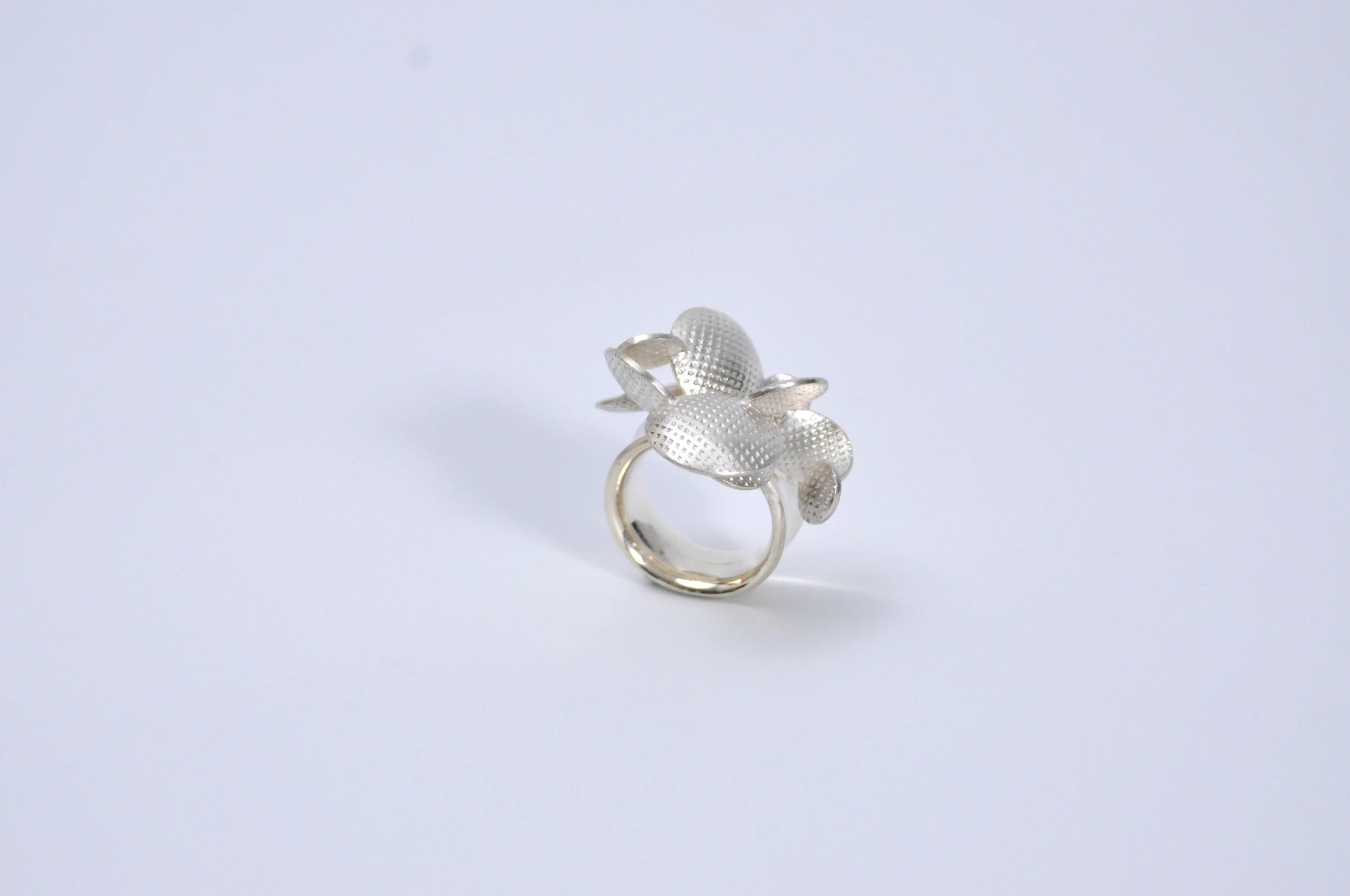 A gyűrűsínen a látszólag rendezetlen szirmok rásimulnak az ujjakra. A Szirom kollekció minden darabja egy klasszikus ötvös technikával, a viaszveszejtéses öntéssel készül 925 ezrelék finomságú Sterling ezüstből.