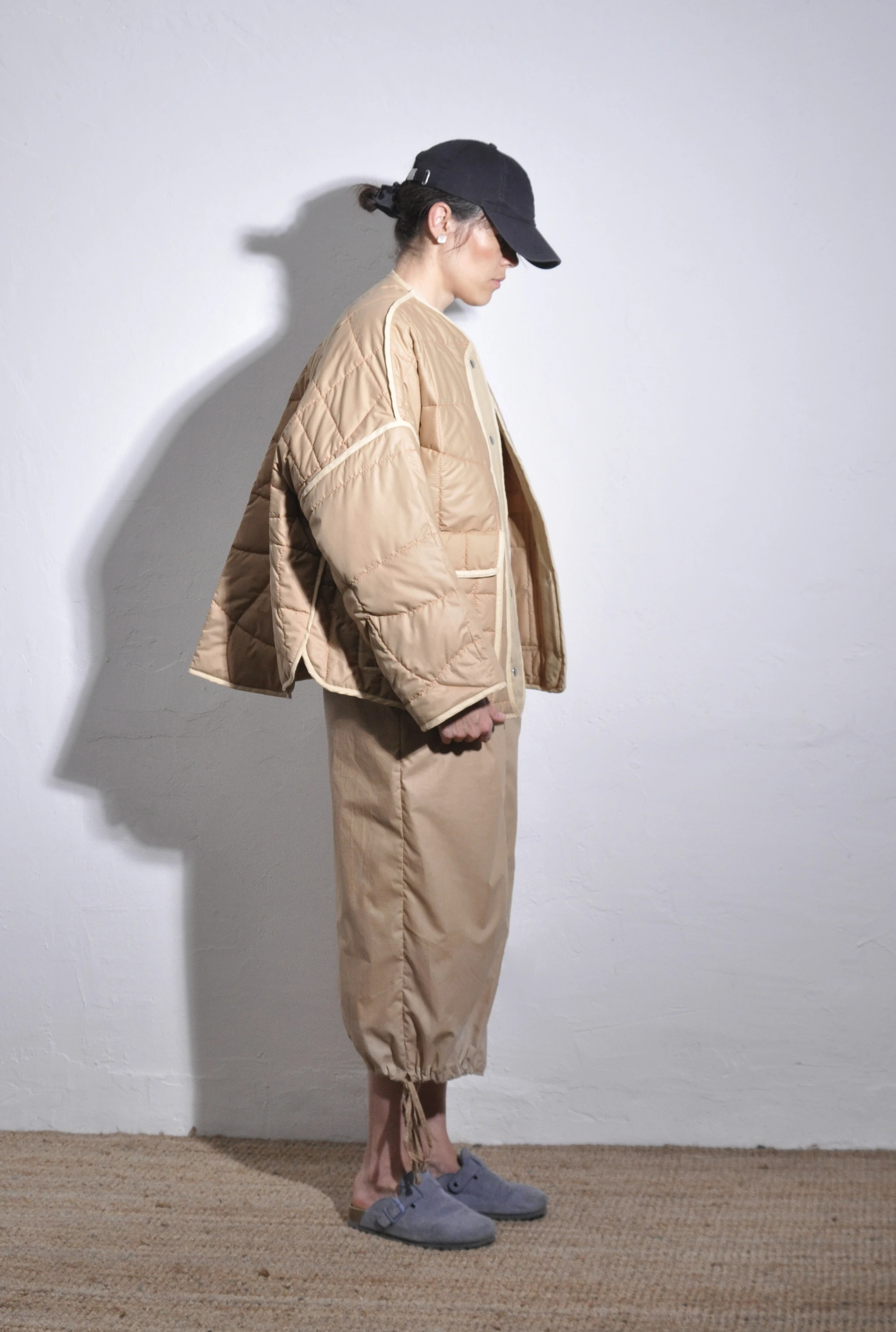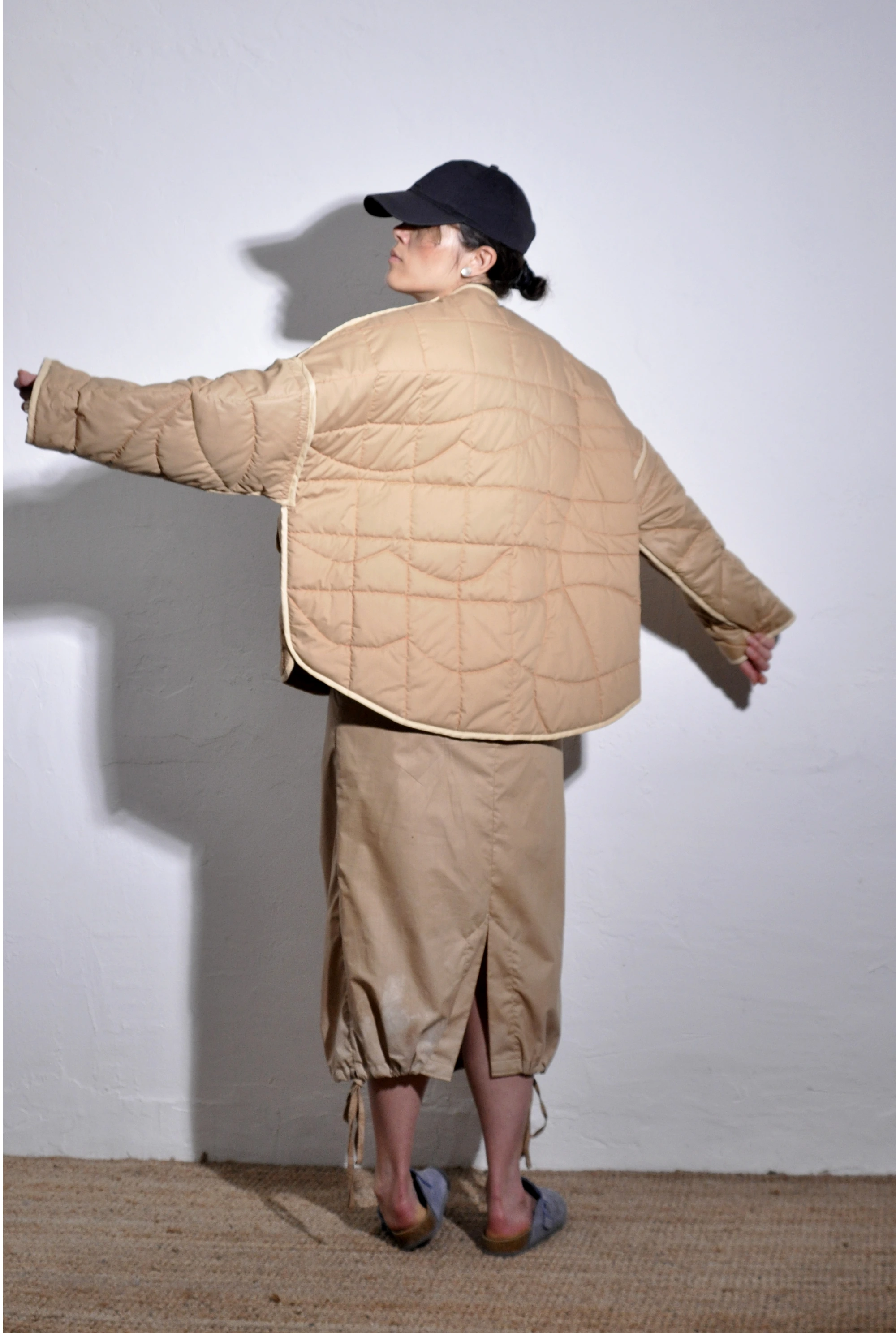 A kabát mintázatát tájképrajzokon alapuló, különleges varrás adja. A kabát kifordítható, közepes vastagságú alapanyaga és oversize szabása lehetővé teszi a réteges aláöltözést; egyszerre biztosít könnyed és meleg viseletet, így az őszi-téli időszakban is a ruhatár egyik alapdarabja lehet. Gallér nélküli, unisex szabással és részletes kidolgozással készült, praktikus első zsebekkel.