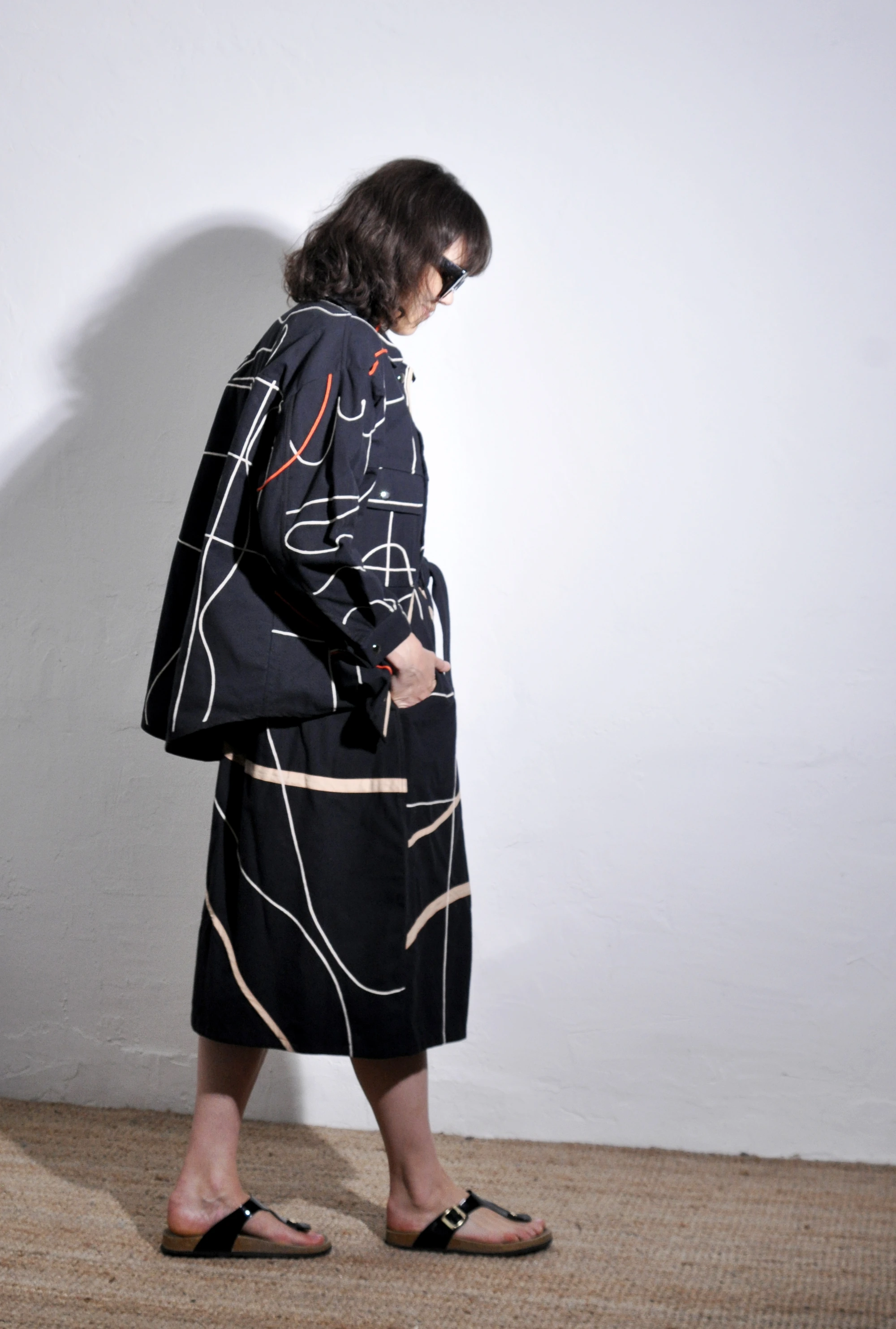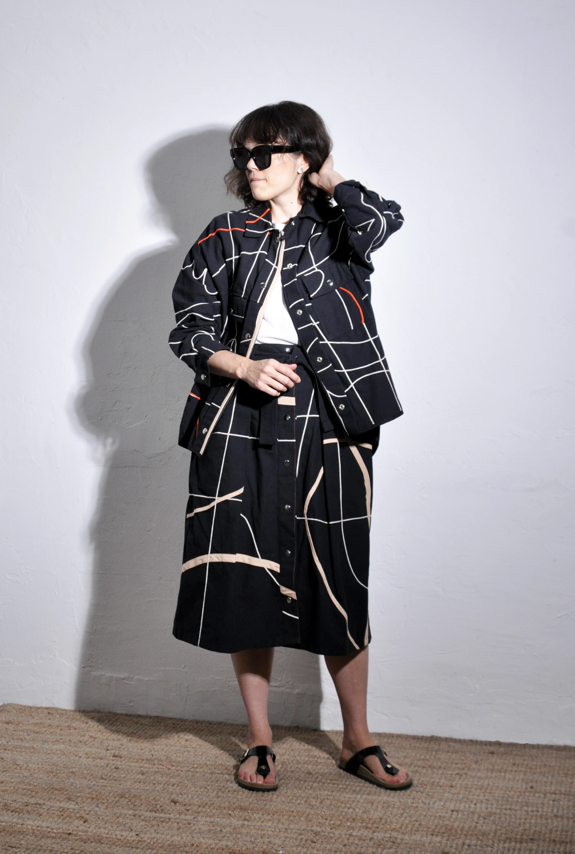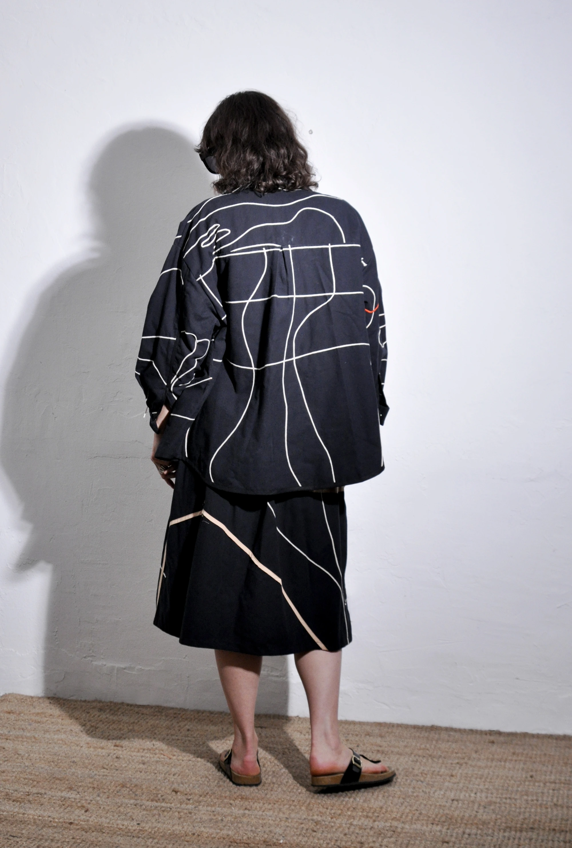 A dupla rétegű, oversize szabású farmerdzseki mintázatát tájképrajzok ihlette, különleges varrás adja, a klasszikus szabás és különleges mintázat találkozásából izgalmas kontraszt jön létre. Patent záródással, első és belső zsebeivel kényelmes és praktikus viselet, minden évszakban alapdarab.