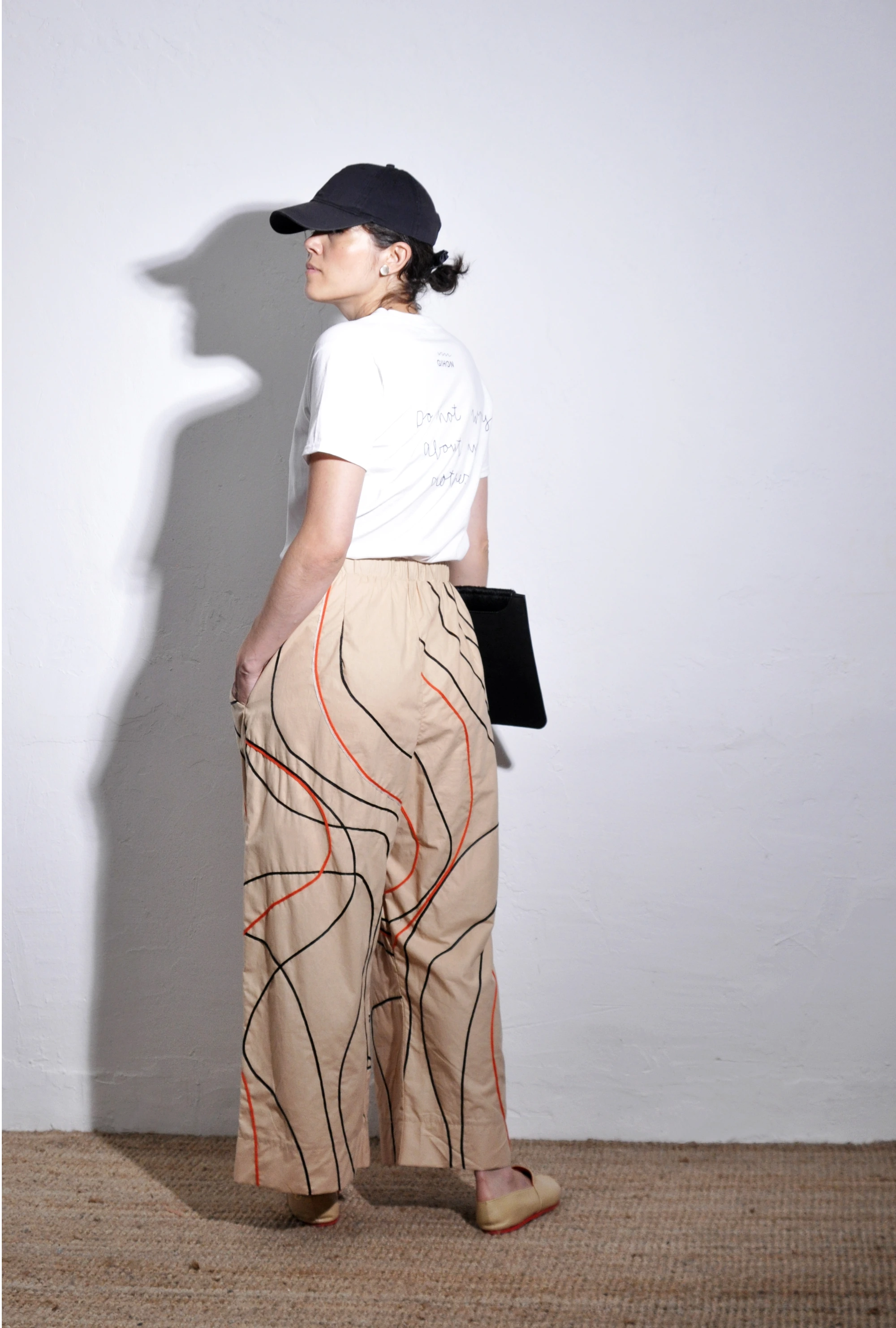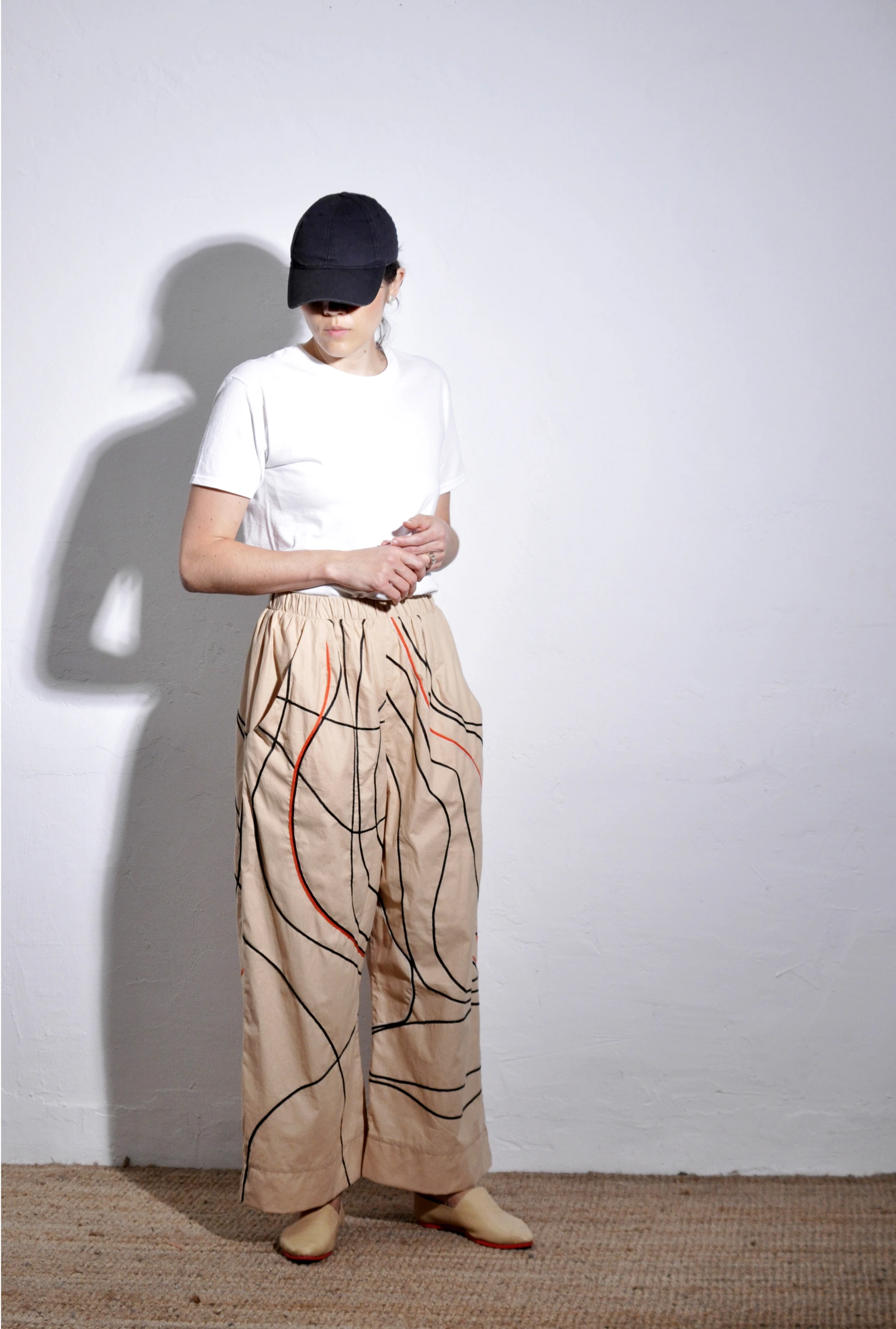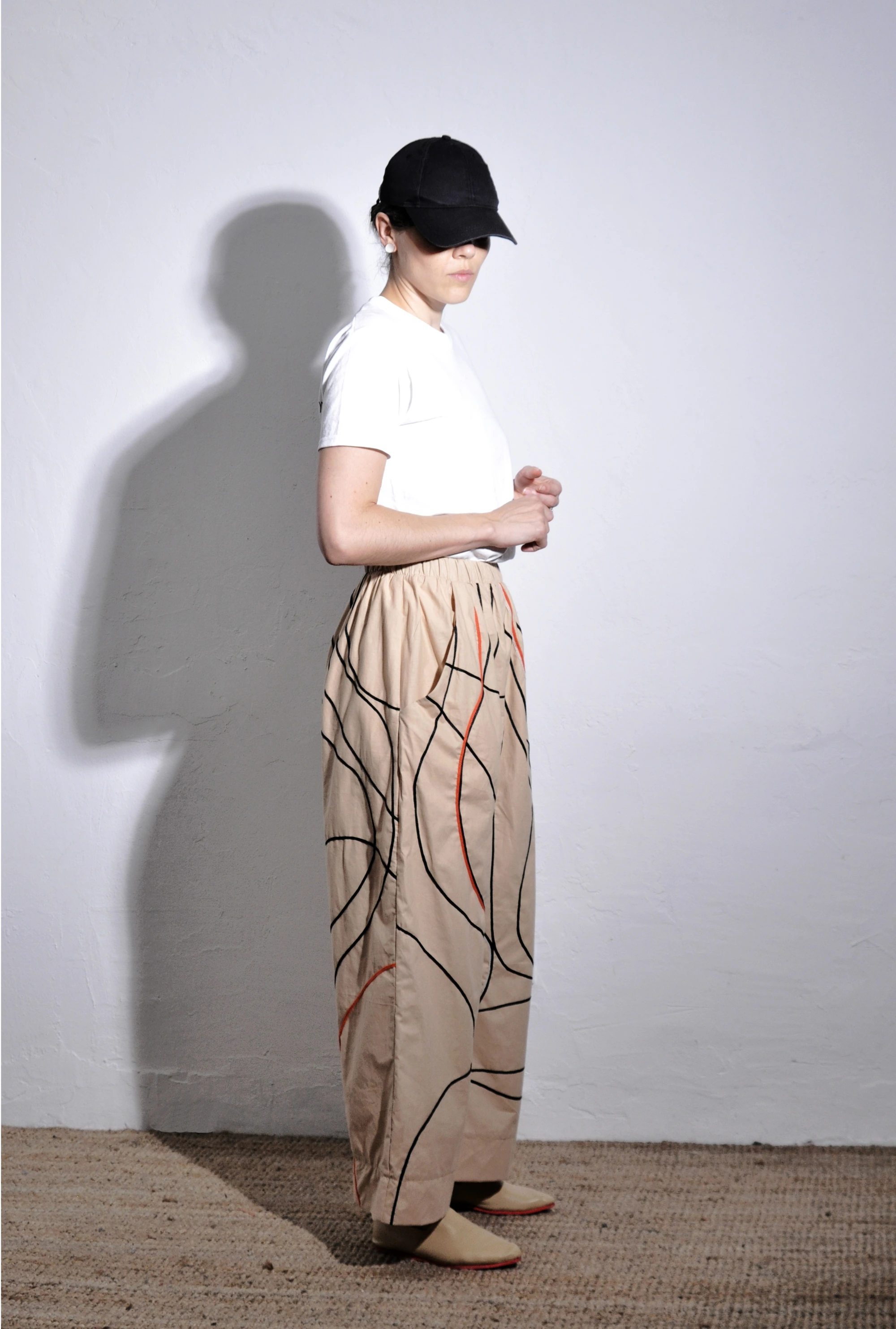 Egyenes szabású, gumis derekú nadrág, kényelmes zsebekkel. A nadrág különlegessége a tájkép vázlatok alapján varrott, grafikus mintázat. A könnyed anyag, laza szabás és a karakteres mintázat izgalmas kontrasztot hoz létre a mindennapi viseletben, a Gihon alapdarabok egyike.